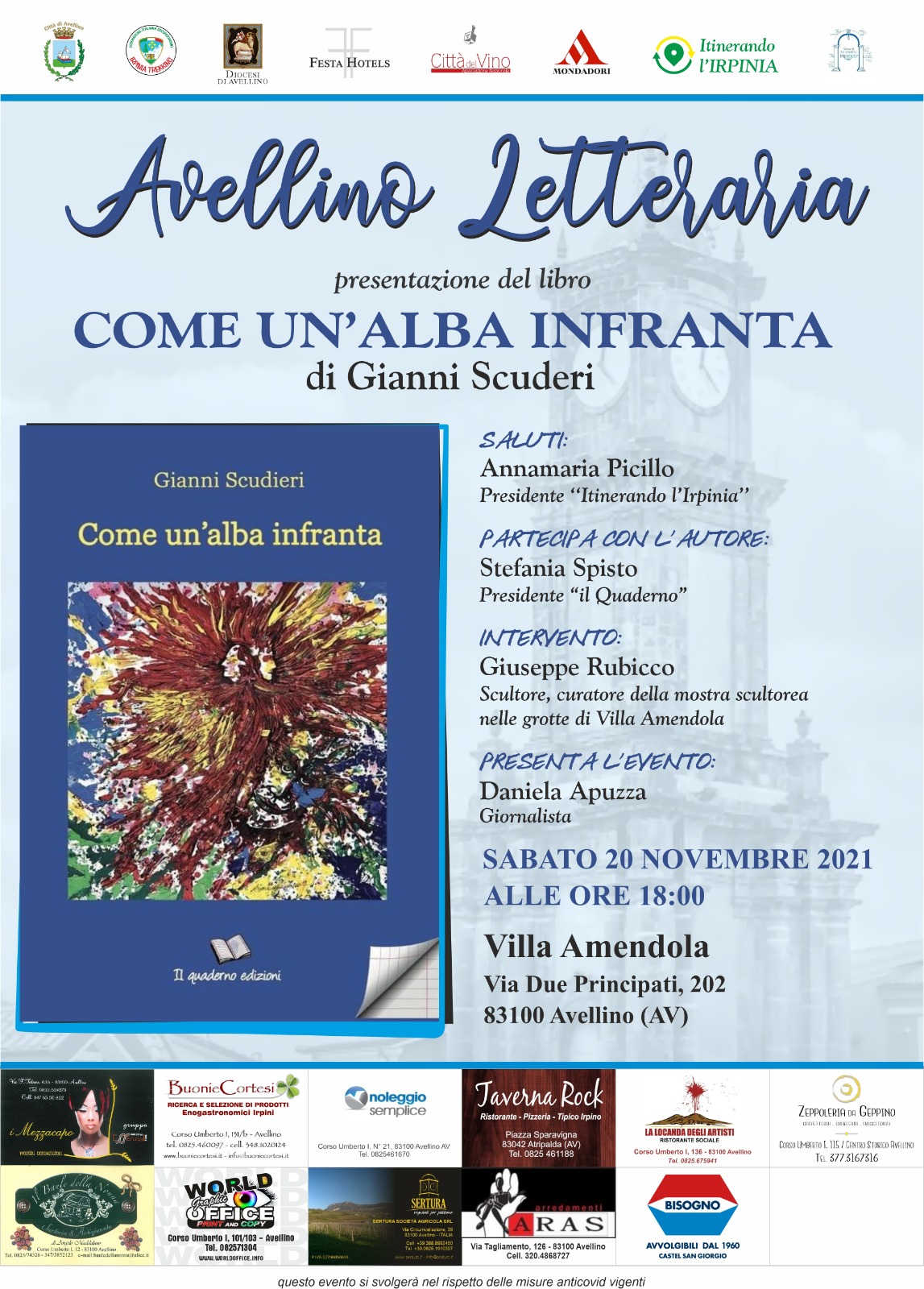 Continuano i salotti culturali, della rassegna, “Avellino Letteraria”organizzata da Annamaria Picillo, presidente di Itinerandol’Irpinia. Ospite sabato 20 novembre, alle 18 a Villa Amendola, lo scrittore Gianni Scudieri, nato a San Giuseppe Vesuviano, laureato in lingue e letterature straniere, giornalista, critico culturale, musicista e pioniere, di uno dei programmi radiofonici italiani delle prime radio libere, con il programma “Rock-on”. “Come un’alba infranta”, edizioni “Il Quaderno”. Un saggio romanzato, un modo nuovo, alternativo di scrivere, personaggi illustri della musica, della letteratura, del cinema, della pittura, da Luigi Tenco, Jim Morrison, James Dean, Vincent van Gogh, Rodolfo Valentino, Steve McQueen, Edgar Allan Poe, Fedor Dostojevskji, Lucio Battisti, Fabrizio De Andrè, Jimi Hendrix, Amy Winehouse, Charlie Parker, Billie Holiday, Glenn Miller, John Keats, Emily Bronte, Fred Buscaglione, Elvis Presley, Michael Jackson, Buddy Holly e tanti altri, accomunati da genialità e follia, che hanno lasciato questa terra in giovane età e che rivivono attraverso le parole dell’autore e raccontano il loro “stato” attuale e quello che fanno, in una dimensione non umana, ma diversa, apportando nuovi stimoli ed idee alla cultura universale. Partecipa con lo scrittore Scudieri, Stefania Spisto, presidente de Il Quaderno. Nelle grotte di Villa Amendola, è possibile visitare fino a gennaio 2022, la mostra “Riuso” a cura dello scultore avellinese, Giuseppe Rubicco, che interverrà nel corso della serata. Opere in vetro,realizzate con l’arte del riciclo, impreziosite dai giochi di luce,creati dagli artisti Collettivo Agata. A coordinare l’evento la giornalista Daniela Apuzza.