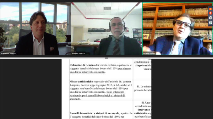 Si è tenuto oggi il convegno organizzato dall’ordine degli architetti della provincia di Avellino, in modalità webinar, dal tema “ Decreto Rilancio: superbonus al 110%, il focus sulle procedure amministrative”. Hanno introdotto l’evento formativo l’arch. Erminio Petecca, presidente dell’ordine degli architetti di Avellino e il dott. Francesco Tedesco, presidente dell’ordine dei commercialisti di Avellino. Ha relazionato il dott. Luca De Stefani, redattore della rivista specializzata “Edilizia e Territorio” del Sole 24 ore. Ha moderato l’arch. Vincenzo De Maio, vice presidente dell’ordine degli architetti di Avellino. Questo webinar, quarta tappa di approfondimento sul tema, è stato promosso in collaborazione con l’Ordine dei dottori Commercialisti. Ha permesso di familiarizzare con la nuova agevolazione e ha aiutato a comprendere quali criticità e quali opportunità riserva, ad ogni categoria legata al mondo dell’edilizia. Nell’incontro sono stati analizzati aspetti specifici e casi concreti.