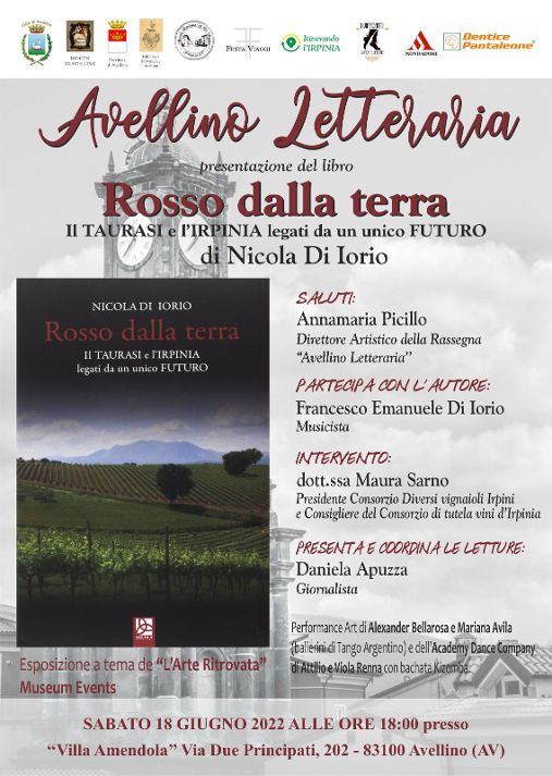 Nuovo appuntamento per la rassegna “Avellino Letteraria” ideata ed organizzata da Annamaria Picillo, direttore artistico dell’evento è promossa da Festa Viaggi -Itinerando l’Irpinia. Sabato 18 giugno alle 18, presso la storica dimora, Villa Amendola, sarà presentato il libro, “Rosso dalla terra”. Il Taurasi e l’Irpinia legati da un unico futuro, di Nicola di Iorio, esperto in comunicazione, sviluppo locale, sommelier e cultore della storia del Mezzogiorno, da anni impegnato a raccontare il suo territorio e l’immagine della nostra bella Irpinia. “Rosso dalla terra”, lavoro storico ed antropologico edito Delta 3, evidenzia i punti di forza e di debolezza del nostro territorio irpino, una attenta analisi, curiosità sull’Aglianico come vino autoctono e la ricerca sulle origini del nome “Taurasi”, oggi indicazione di Docg, il tutto narrando la storia dei paesi irpini. Partecipa con l’autore, Francesco Emanuele Di Iorio, musicista. Interviene nel corso della serata, Maura Sarno, presidente, consorzio diversi vignaioli irpini e consigliere del consorzio di tutela vini d’Irpinia. La passione per il vino e la magica danza, coinvolgeranno i presenti con la performance art di Alexandre Bellarosa e Mariana Ávila, ballerini di tango argentino e dell’Academy Dance Company, di Attilio e Viola Renna, con bachata Kizomba. Esposizione a tema de “L’arte Ritrovata” Museum & Events. Coordina l’evento la giornalista Daniela Apuzza.