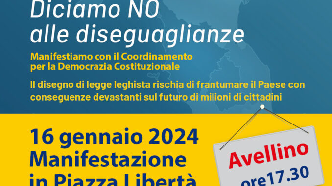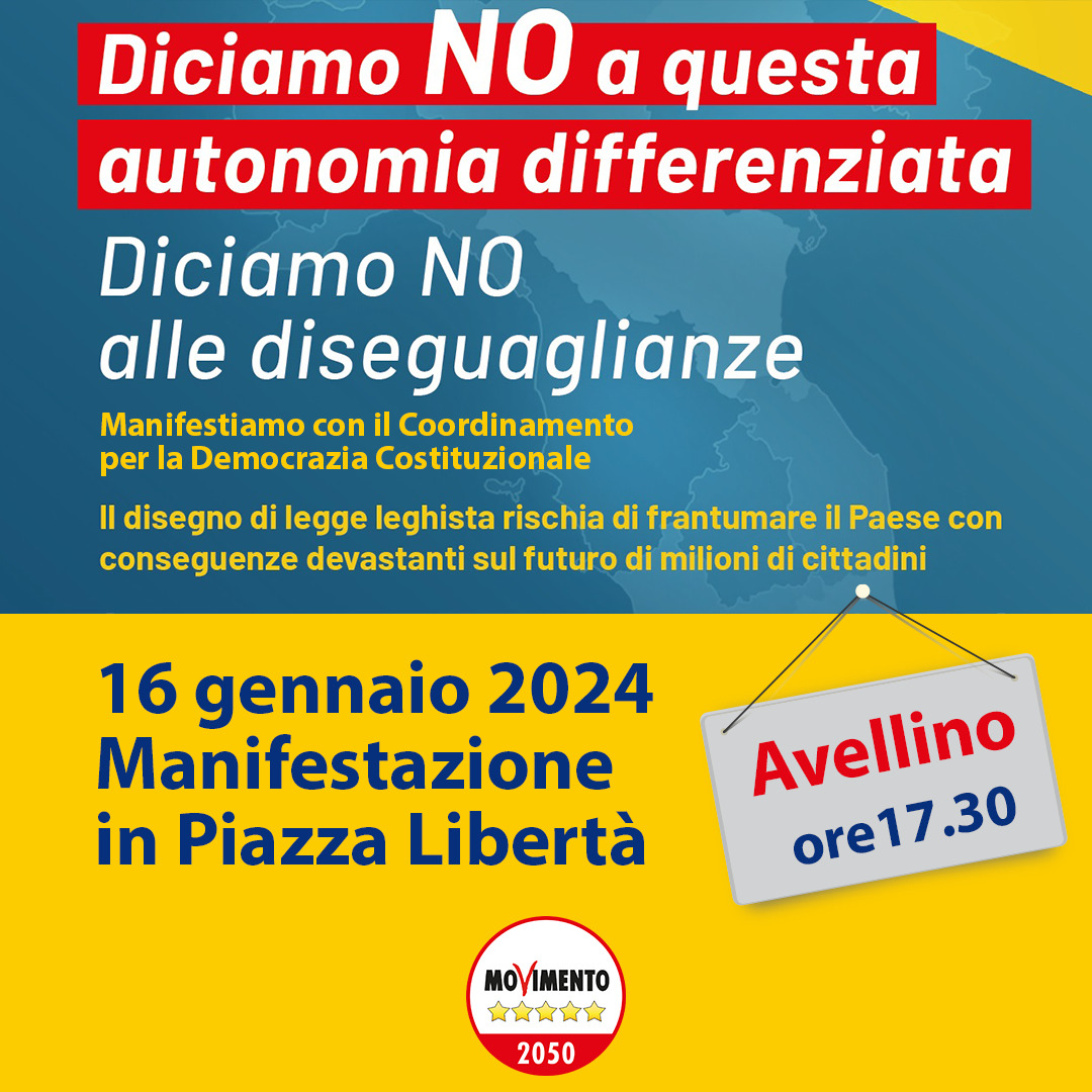 Il Movimento Cinque Stelle partecipa all’iniziativa a difesa della Costituzione e contro il Ddl Calderoli il 16 gennaio 2024 ad Avellino in piazza Libertà presso la prefettura alle ore 17.30.