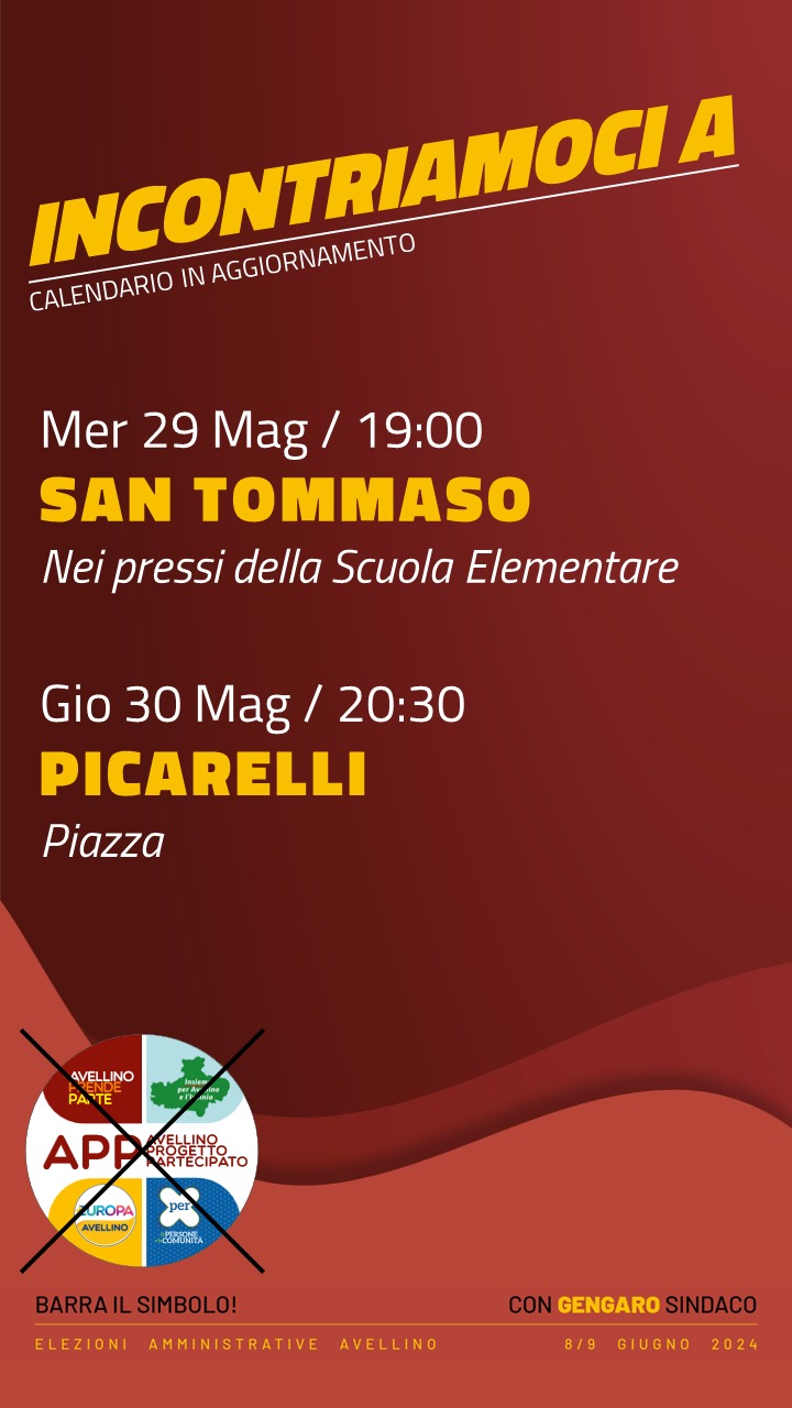 La campagna elettorale di APP – Avellino Progetto Partecipato entra nel vivo con una serie di eventi per incontrare i cittadini, presentare le nostre proposte e confrontarci sulle idee per il futuro della città. Il prossimo appuntamento sarà domani Giovedì 30 Maggio alle ore 20.30 in piazza a Picarelli.
