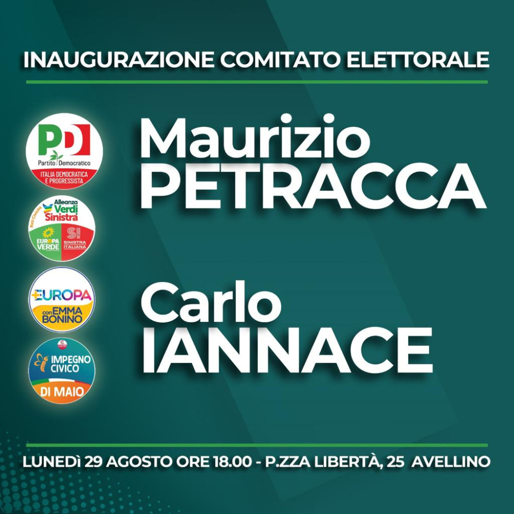 Si terrà domani (lunedì 29 agosto) con inizio alle ore 18,00 l’inaugurazione del comitato elettorale di Maurizio Petracca, candidato alla Camera dei Deputati nel collegio uninominale di Avellino e di Carlo Iannace, candidato al Senato della Repubblica nel collegio uninominale Avellino-Benevento. Entrambi sono candidati dal Partito Democratico con il sostegno di Alleanza Verdi e Sinistra, di +Europa e di Impegno Civico.