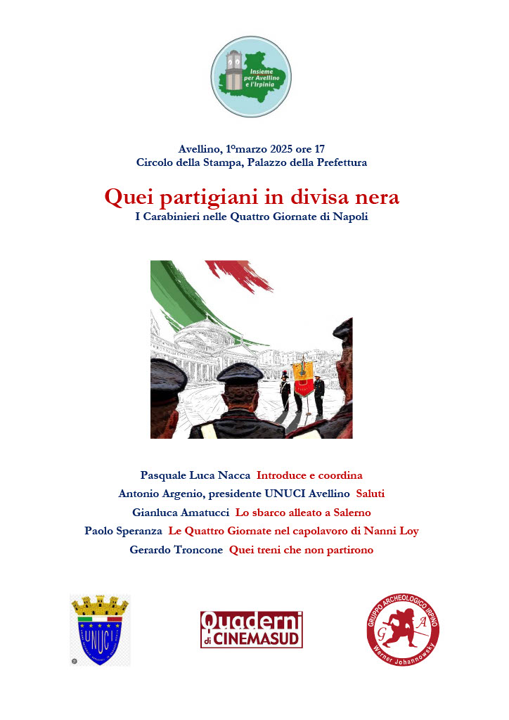 Un incontro si terrà ad Avellino il 1° marzo 2025 alle ore 17:00 presso il Circolo della Stampa, Palazzo della Prefettura, per approfondire il ruolo dei Carabinieri nelle Quattro Giornate di Napoli. Il convegno, intitolato “Quei partigiani in divisa nera”, metterà in luce il contributo dell’Arma nella lotta contro l’occupazione nazista, ricordando il coraggio e il sacrificio di quei militari che decisero di schierarsi con il popolo napoletano.