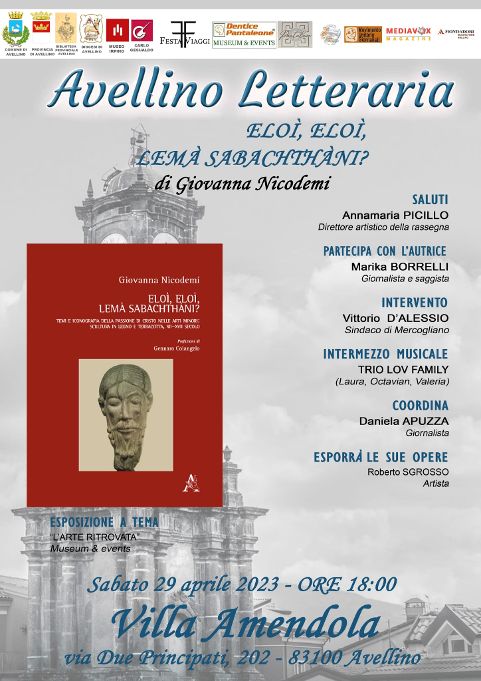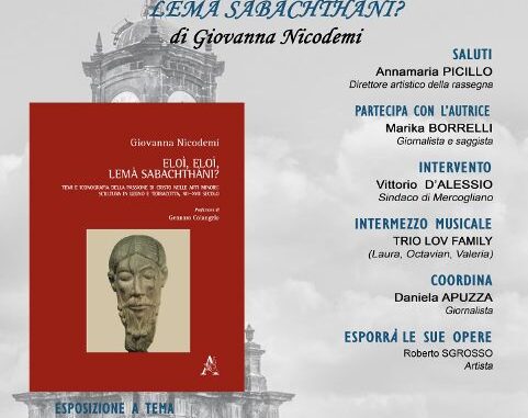 Sarà la scrittrice, Giovanna Nicodemi, la nuova protagonista dell’appuntamento con la rassegna Avellino Letteraria, sabato 29 aprile alle 18.00, a Villa Amendola. L’autrice presenterà, il testo Eloì, Eloì. Lemà Sabachthani? Temi e iconografia della Passione di Cristo nelle Arti minori, legno e terracotta. Il libro, affronta un argomento finora mai trattato in assoluto in tale ambito. La ricerca condotta in un lungo arco di tempo, si snoda in quella che l’autrice definisce “pentalogia funebre”, analizzandone, dal punto di vista storico, artistico, antropologico, devozionale e sociale i “tempi”. Di questi vengono esaminate opere salienti, disseminate in un periodo lunghissimo che va dal XII al XVII secolo, da cui trarre il significato culturale del loro sistema di simboli e la ragione emotiva, etica e religiosa che ha prodotto manufatti di indubbia valenza artistica. Il testo ha avuto una grande accoglienza da parte di S.E. Rev.ma Cardinale Mario Grech, Segretario Generale del Sinodo dei Vescovi, che ne ha voluto la presentazione nella sua Diaconia, la Basilica dei Santi Cosma e Damiano, in Via dei Fori Imperiali a Roma. Inoltre esso è stato acquisito ed inserito nel Catalogo della Yale Library dell’Università Yale a New Haven in Connecticut. Dopo il saluto della direttrice artistica, Annamaria Picillo, a confrontarsi con l’autrice, la giornalista e saggista Marica Borrelli, con intervento del sindaco di Mercogliano, Vittorio D’Alessio. Interludio musicale a cura del Trio Lov Family. L’artista Roberto Sgrosso, esporrà opere, realizzate con materiali di recupero accompagnato da decisi elementi figurativi e decorativi, così come temi più tradizionali, si affiancano ad una sensibilità tutta contemporanea verso l’ambiente, o richiami al mondo classico. Esposizione a tema “L’arte ritrovata”, Museum & Event. Coordina l’evento, la giornalista Daniela Apuzza.