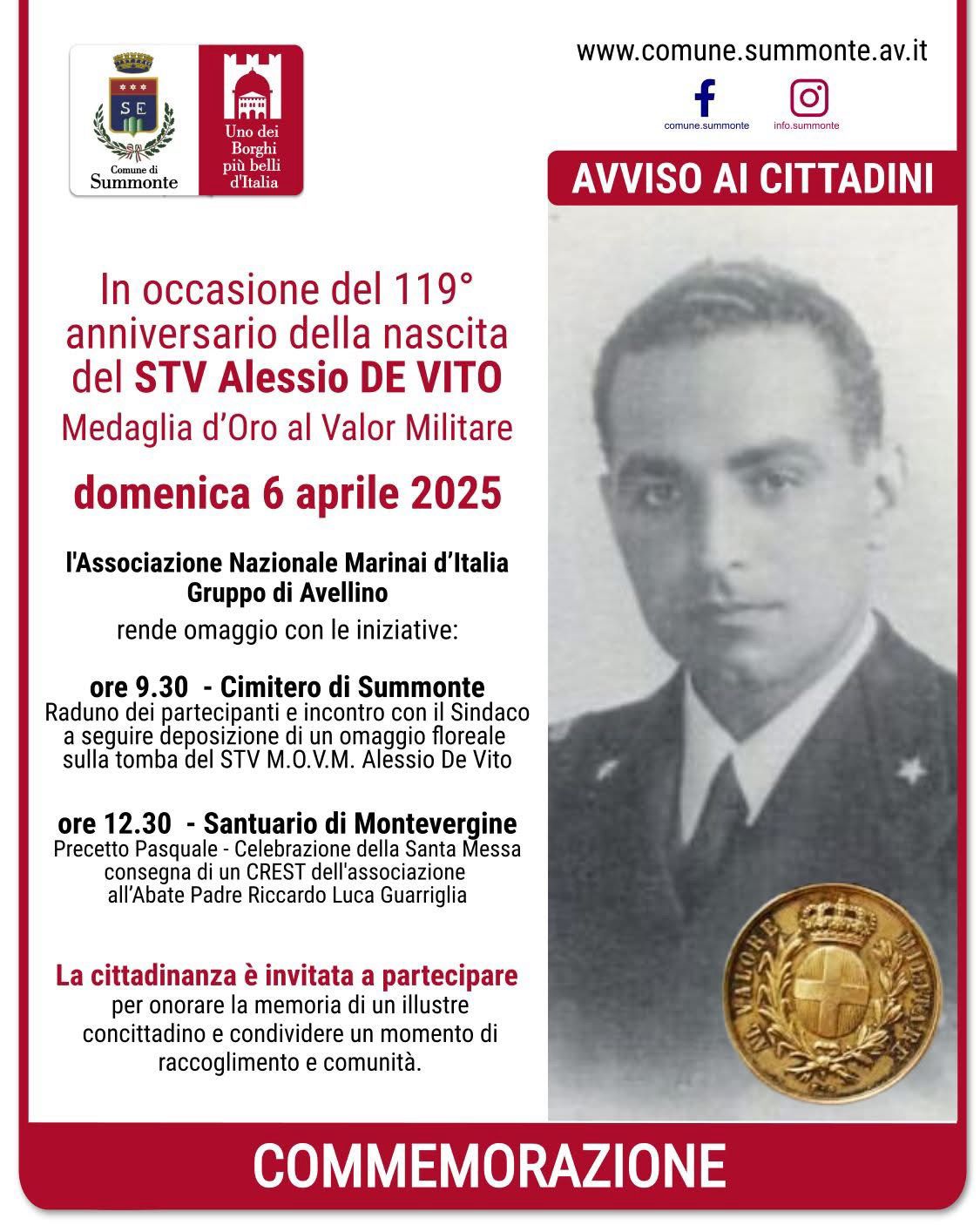 In una mattinata carica di emozione e significato, il Comune di Summonte ha celebrato il 119° anniversario della nascita del Sottotenente di Vascello Alessio De Vito, Medaglia d’Oro al Valor Militare, figura simbolo di coraggio e sacrificio per l’intera comunità irpina.