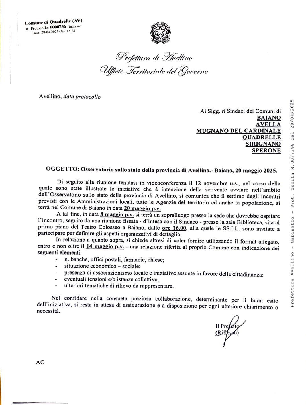Osservatorio sullo stato della provincia di Avellino. 30/04/2025 binews.it BAIANESE, EVIDENZA 0 Riceviamo dal sindaco Rozza del Comune di Quadrelle