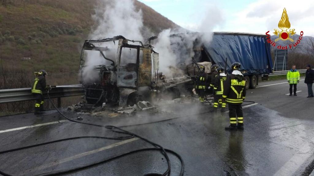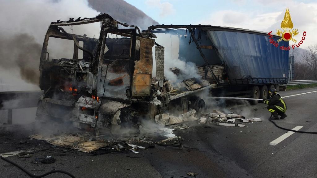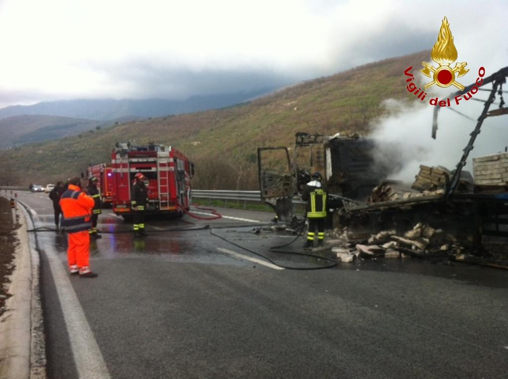 Ecco le foto relative all’incendio del tir avvenuto sull’A16 subito dopo le ore 16’00 di oggi 7 marzo, i Vigili del Fuoco di Avellino sono dovuti intervenire sull’autostrada A 16, Napoli-Canosa in direzione Napoli, dopo circa due chilometri dal casello di Baiano, al Km. 29,900, per un incendio che ha visto coinvolto un autotreno che trasportava pietre lavorate. Due le squadre prontamente intervenute che hanno provveduto allo spegnimento del pesante automezzo avvolto dalle fiamme; durante le operazioni l’autostrada è rimasta chiusa al traffico nella direzione Napoli. Ci sono volute circa tre ore di lavoro con la conseguente messa in sicurezza dell’area interessata dall’incendio.