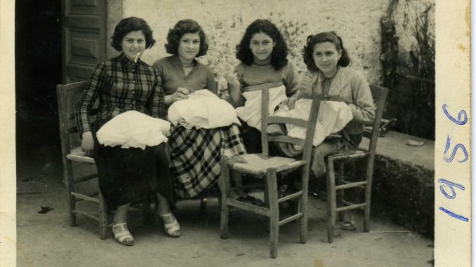 Quattro ragazze sono sedute a ricamare, concentrate e consapevoli del lavoro da svolgere.