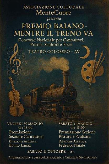 “Premio Baiano – Mentre il treno va” è un riconoscimento al talento di cantautori, pittori, scultori, grafici e poeti che si svolgerà il 30 e 31 maggio 2025 a Baiano, ideato e promosso dall’Associazione MenteCuore, diretto artisticamente da Bruno Lanza con il patrocinio del Comune di Baiano.