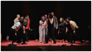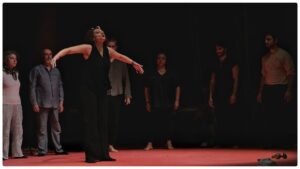 Un invito,- giunto a metà spettacolo e lanciato da Vincenzo Del Prete, il visionario dell’aperta e confidente speranza da riporre nella serenità per il presente e il futuro, senza patemi e introversi ripiegamenti su di sé, per vivere una vita appagante, senza eccessi e in composta sobrietà – pienamente accolto dalla platea in sold out; un invito che voleva essere- com’era ed è- testimonianza di partecipe e convinta coralità, per la quale e con la quale la pluralità degli io, non può che ri–trovarsi e ri–conoscersi nella vastità incommensurabile del noi, per quanto mutevole e varia possa essere, ed é. Un’espressione di teatro sociale di alto e persuasivo linguaggio scenico, gestuale e costumi, ma soprattutto di contenuti–idee, frutto di una proficua e coinvolgente attività di studio assiduo e di esercitazione metodica in Laboratorio, sviluppata nei locali di Proteatro, in piazza IV Novembre, con l’incisiva e spigliata coordinazione dei registi, Lubomyr Martin Bukovy, slovacco, e Franco Scotto.