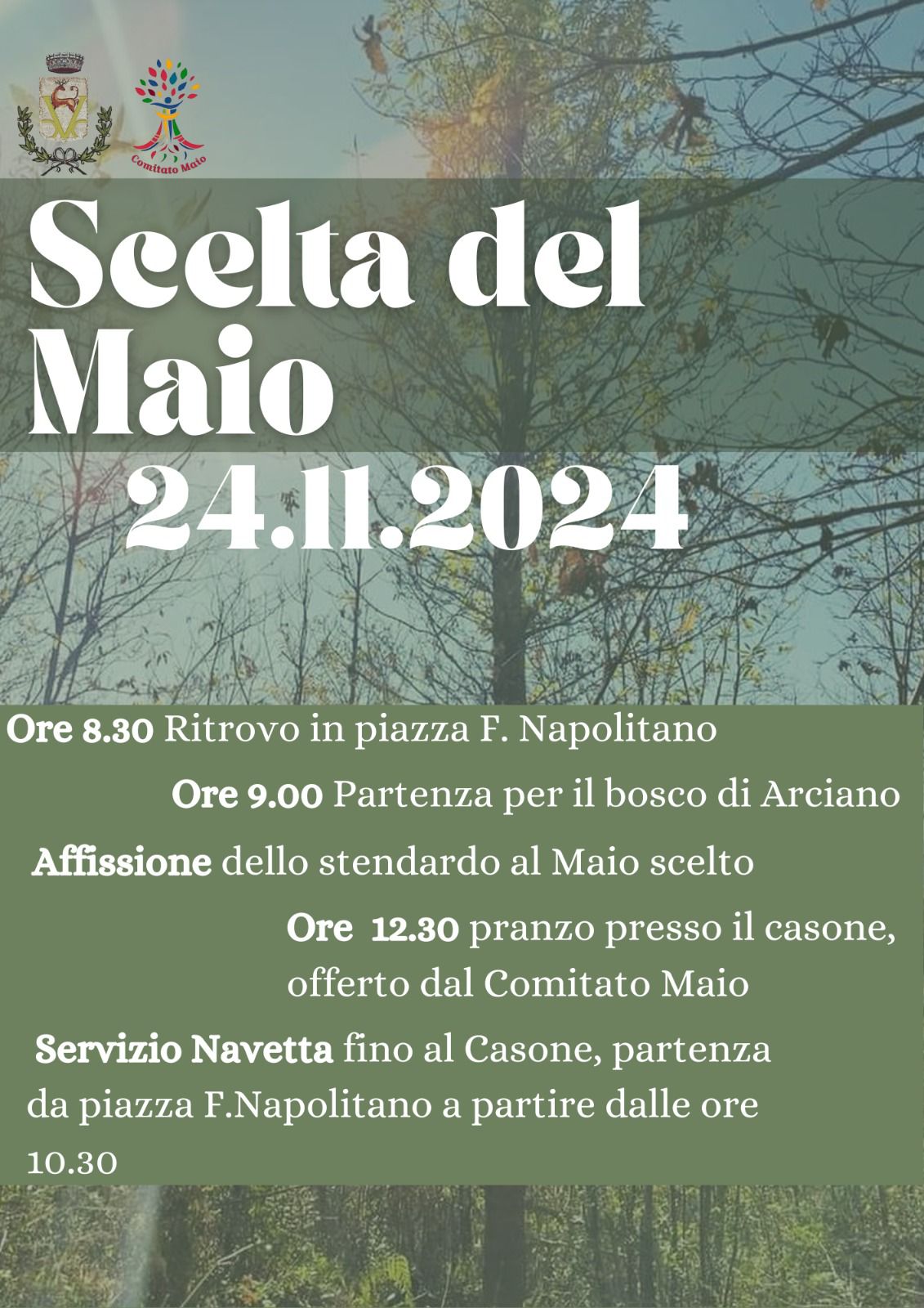 Il programma prevede il ritrovo alle 8.30 in Piazza Francesco Napolitano, dove i partecipanti si raduneranno per iniziare il percorso verso il Bosco di Arciano. Alle **9.00** partirà il corteo, diretto alla scelta del grande albero simbolo della festività. Uno dei momenti più suggestivi sarà l’**affissione dello stendardo al Maio selezionato**, un rito carico di significato che celebra la comunione tra tradizione, fede e natura.