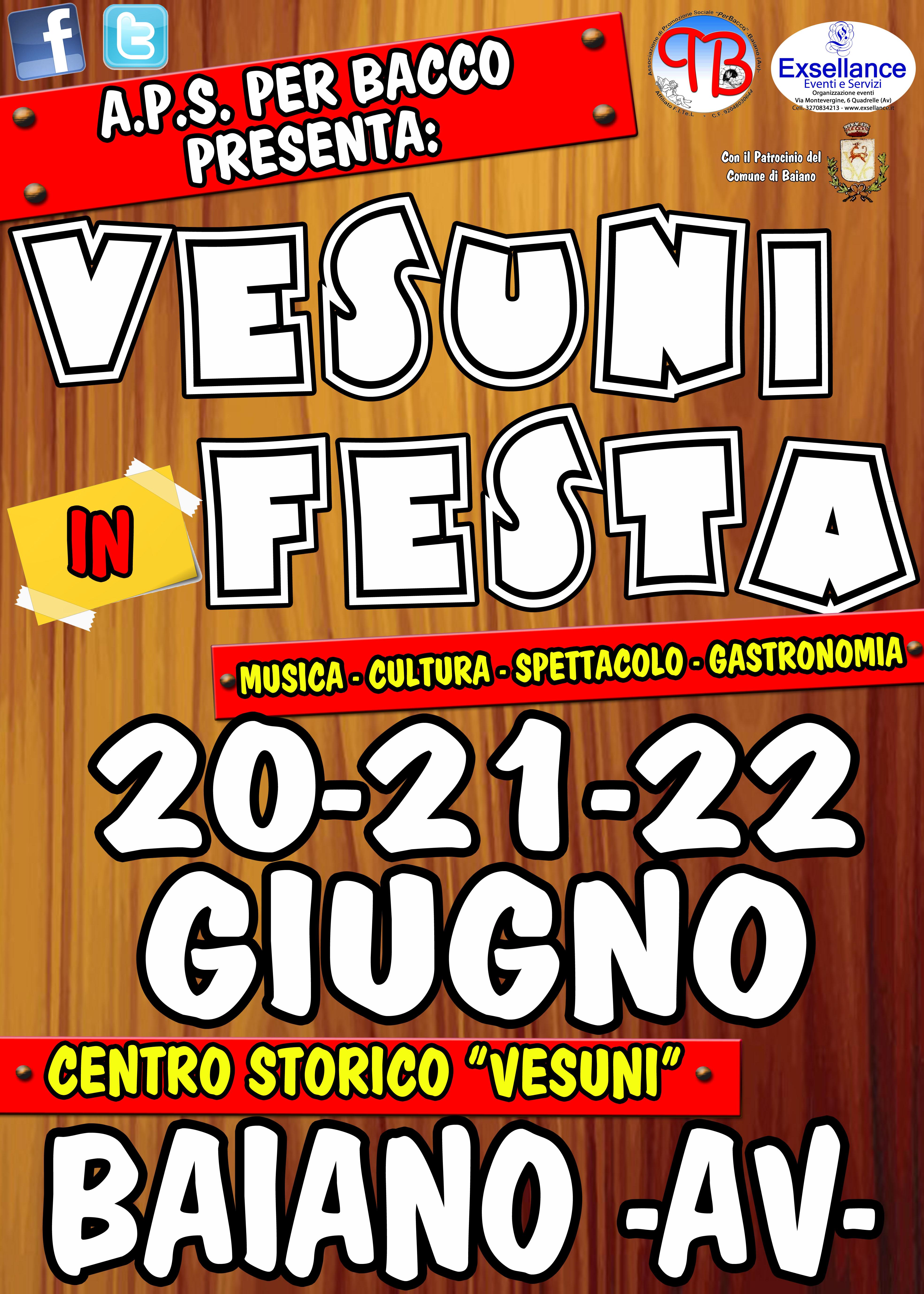L’ormai noto appuntamento dell‘Associazione di Promozione Sociale “Per Bacco” con la 14^ ed. di “Vesuni in Festa… because we’ re Happy!” sta arrivando! La manifestazione avrà luogo tra portoni, cortili e vicoletti del centro storico “Vesuni” di Baiano Venerdì 20, sabato 21 e domenica 22 Giugno 2014.