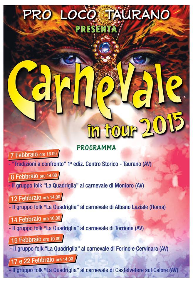 TAURANO: molto viva e attiva è la tradizione carnevalesca nel borgo di Taurano che viene portata avanti soprattutto grazie all’opera della Pro Loco che da anni esporta questa tradizione in altri centri italiani e esteri. Varie sono le attività legate al Carnevale tra cui il funerale di Carnevale (accompagnato da un corteo ed una banda musicale e si conclude con l’incendio del fantoccio di Carnevale), la rappresentazione dei Mesi, la Quadriglia e il Laccio d’amore.