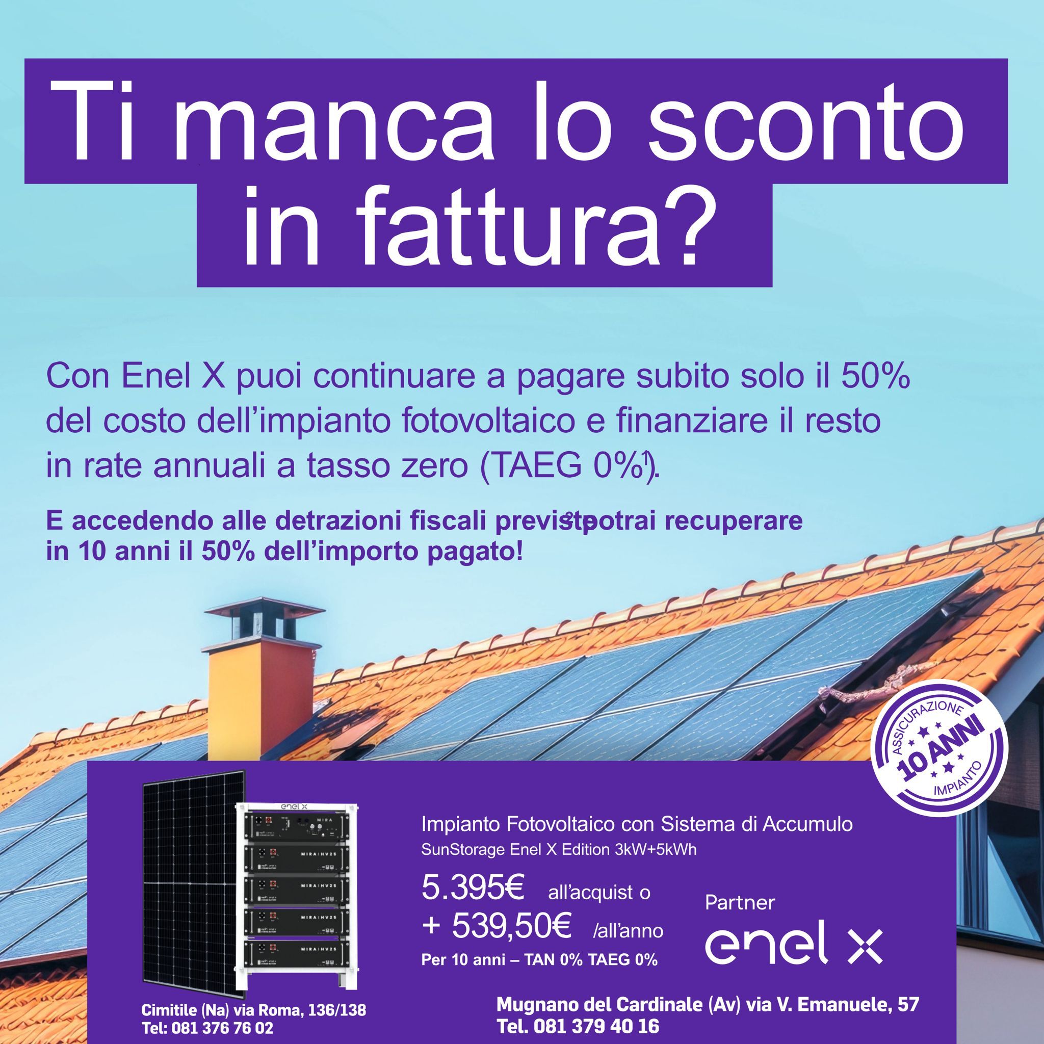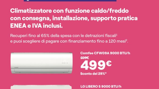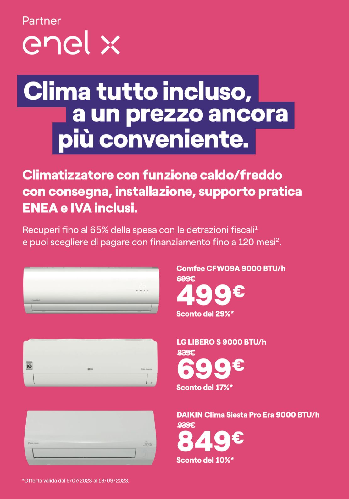 Climatizzatore con funzione caldo/freddo con consegna, installazione e supporto pratica Enea. Recuperi fino al 65% della spesa con le detrazioni fiscali. Offerta valida fino a sabato 12 agosto 2023. Recati presso il nostro Spazio Enel Partner di Cimitile o Mugnano del Cardinale per tutte le informazioni di cui hai bisogno.