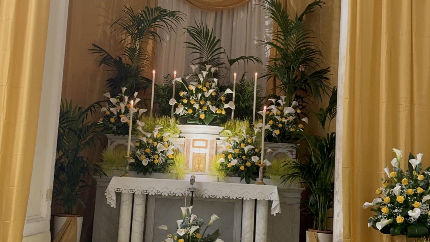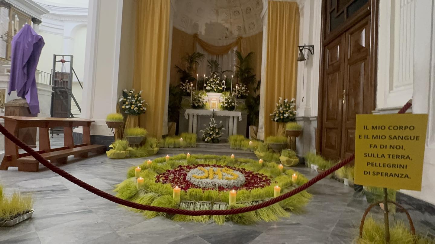 Quest’anno i fedeli, nell’osservare la tradizionale visita del Giovedì Santo, sono rimasti affascinati dal meraviglioso scenario dell’altare preparato per il rito dal comitato Parrocchiale. Il valore aggiunto è stata la “Bellezza”, che è sempre un Dono di nostro Signore, una prova tangibile del suo Amore per noi. La scena è stata costruita per esaltare il valore dell’Ostia, simbolo cristiano che rappresenta il corpo di Gesù Cristo e la scritta JHS che è un’abbreviazione latina del nome greco di Gesù. A centro della scena campeggia un’installazione rappresentativa di questo simbolo: un letto di fiorellini di colore bianco (simbolo di purezza e di pace), le Nebbioline, su uno strato di piantine di grano e arricchito da petali di rose che risaltano con il loro colore rosso intenso, simbolo del sacrificio di sangue di Gesù. Il contorno di piantine di grano dall’intenso colore giallo conferisce valore alla rappresentazione dell’Ostia e crea un estasiante effetto di colore che ci ha incantati. La fiamma di ceri accesi inseriti lungo il perimetro aumenta l’effetto scenico. Larghi drappi di colore bianchi e gialli ai lati e al fondo della scena conferiscono solennità all’altare. Otto bouquet di fiori sempre bianchi e gialli (Calle, o donne in camicia e rose gialle) adornano l’altare mentre la fila di piantine di grano perimetra l’intera scena.