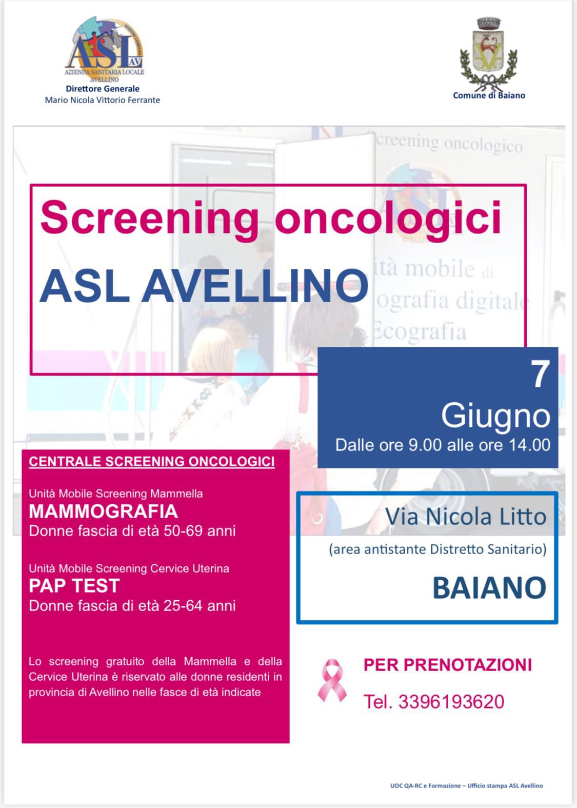 BAIANO (AV) — Una giornata interamente dedicata alla prevenzione. Il prossimo 7 giugno, dalle ore 9:00 alle ore 14:00, in Via Nicola Litto (nell’area antistante il Distretto Sanitario), a Baiano, sarà possibile sottoporsi gratuitamente a screening oncologici grazie all’iniziativa promossa dall’ASL di Avellino, in collaborazione con il Comune di Baiano.