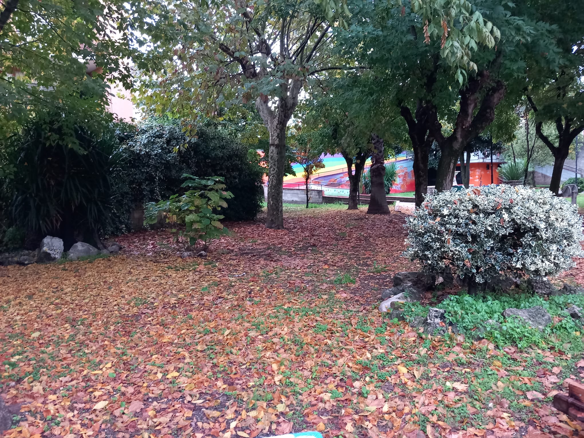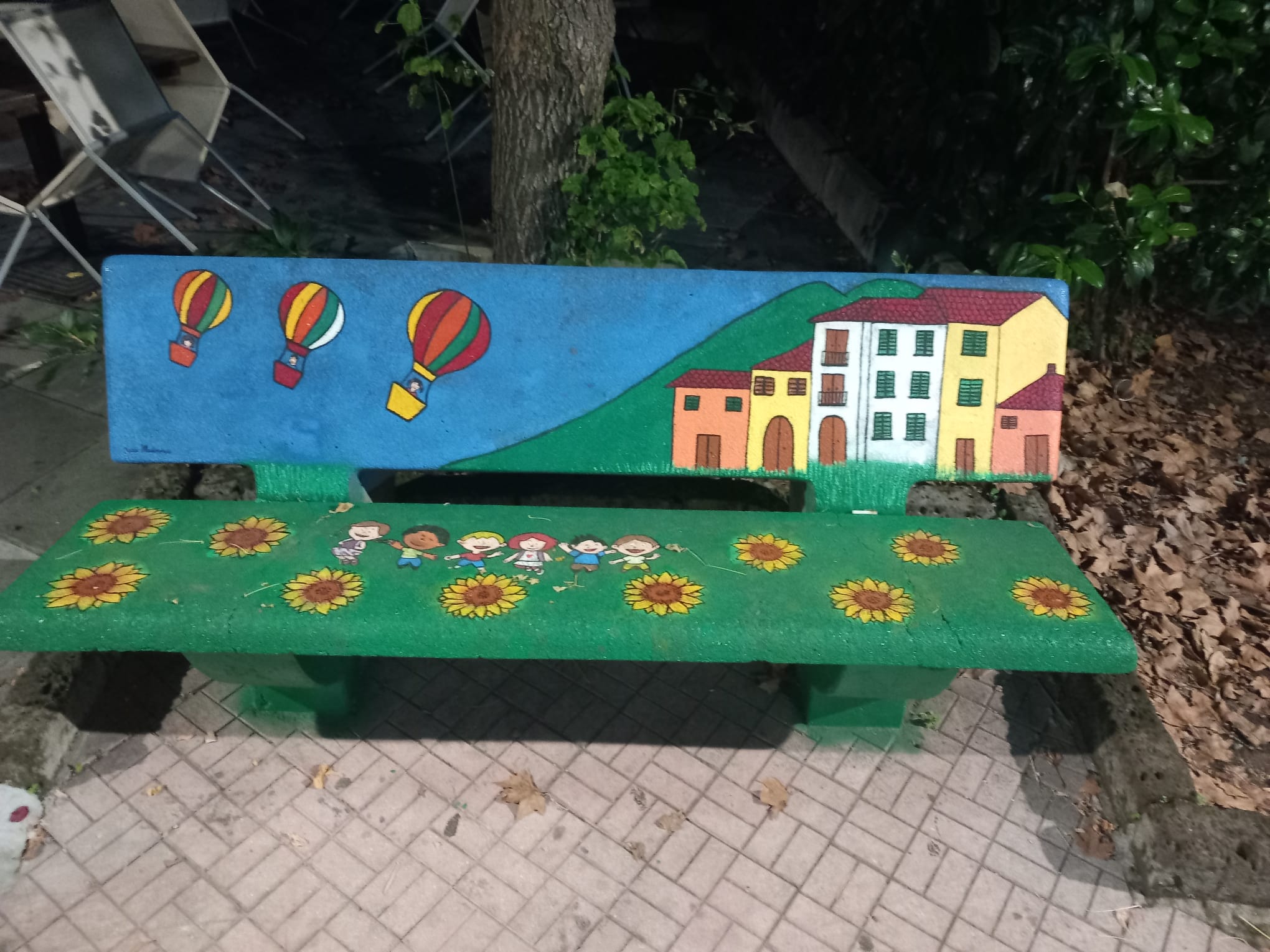 Le due coloratissime panchine che brillano di luce diversa sullo sfondo del tappeto fiorito di foglie costituiscono una diversa e interessantissima funzione della villa, ovvero la trasformazione in un luogo per esperienze artistiche. Ne costituiscono riprova il coloratissimo affresco per celebrare la Pace all’ingresso della Villa (ad opera del Forum Giovani di Baiano, su idea di Chiara Lippiello) e l’artistica installazione alta due metri circa in acciaio Corten, posizionata ai bordi della pista da ballo. “Hortus Artium”, Giardino delle Arti, il titolo dell’opera immaginato dall’autore, Nunzio Capriglione, evidenziato con lettere traforate sulla superficie metallica. Un obiettivo condiviso e sostenuto anche dal sindaco Enrico Montanaro, che ha affidato a un’affermata artista, Sara Madonna, l’incarico di trasformare due semplici panchine in cemento grigio in due coloratissime opere, originali e dal profondo significato. Sulla prima è riportato il pensiero di Malala Yousafzai, pakistana, insegnante e attivista per i diritti umani, premio nobel per la pace nel 2014: