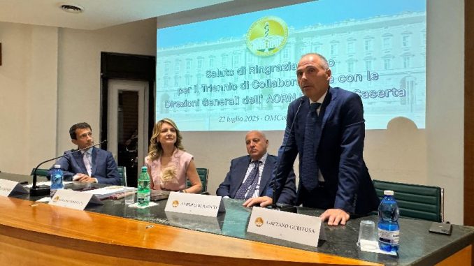 “È questo il ringraziamento spontaneo da parte di tutti i medici della provincia di Caserta per due manager che hanno condiviso con noi un percorso molto lungo, la loro continuità ha portando al raggiungimento di tantissimi obiettivi e al miglioramento del Sistema sanitario provinciale». Queste le parole del presidente dell’Ordine provinciale dei Medici Chirurghi e degli Odontoiatri di Caserta Carlo Manzi in occasione dell’evento di saluto e ringraziamento per la conclusione del triennio di collaborazione istituzionale con le Direzioni Generali dell’AORN e dell’ASL di Caserta. L’iniziativa si è tenuta nell’Auditorium dell’Ordine dei Medici di Caserta alla presenza dei due vertici Amedeo Blasotti dell’ASL Caserta e Gaetano Gubitosa dell’AORN “Sant’Anna e San Sebastiano”.