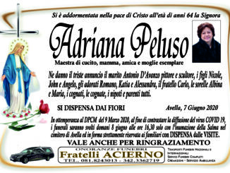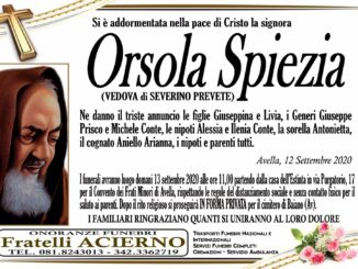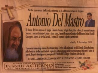 La famiglia annuncia la dipartita della signora D’Apolito Prudenzia di anni 65 di Avella. “Madre esemplare è un’ottima nonna”, la ricordano i figli in particolare Felicia, i nipoti e parenti tutti. Gli stessi familiari ringraziano […]