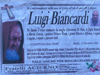 Un grave lutto ha colpito l’assessore Giovanni Biancardi del Comune di Avella, si è spenta la cara mamma, signora Filomena Colucci. Giungono le più sentite condoglianze all’amico Giovanni e alla famiglia da parte di tutta […]