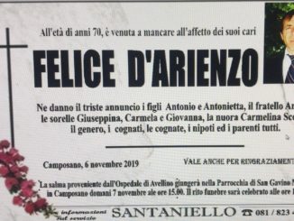 S’è spento Pellegrino D’Avanzo, grande lavoratore con una vita vissuta in un’importante azienda del settore auto, a Pomigliano d’Arco, e dedito al bene della famiglia. Attivamente inserito nella realtà sociale della comunità cittadina, Pellegrino D’Avanzo […]