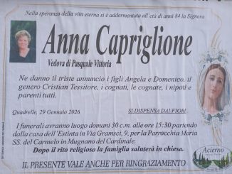 Si è spenta all’età di 84 anni Anna Capriglione, vedova di Pasquale Vittoria, conosciuta e ricordata da tutti come “Nina ’a Bacchettina”. Una figura benvoluta e stimata, legata da sempre alla sua famiglia e alla […]