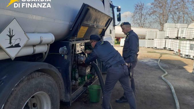 Militari del Comando Provinciale della Guardia di finanza di Napoli hanno sequestrato, ad Acerra (NA), oltre 80.000 litri di gasolio per autotrazione cd. “Designer Fuel” commercializzati illecitamente in evasione di imposta, un’autocisterna con targa italiana, un autoarticolato con targa polacca, 2 elettropompe, un impianto per il rifornimento per autocisterne realizzato clandestinamente e 132 contenitori in plastica da 1.000 litri cadauno.