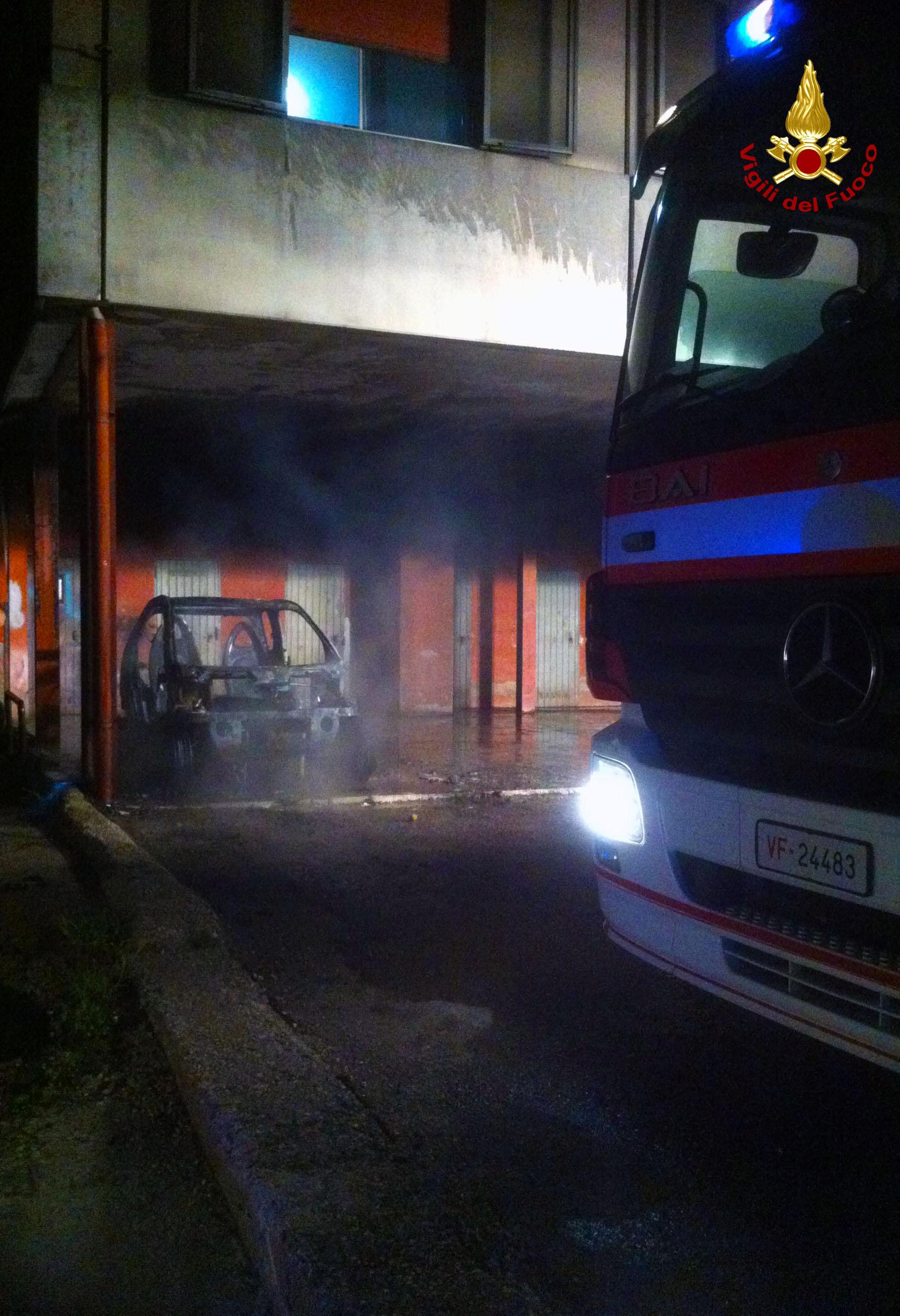 Intorno alle ore 02’00 di questa notte, i Vigili del Fuoco di Avellino sono intervenuti in via Nicolodi, alle spalle del centro sociale Samanta Della Porta, per un incendio che ha interessato un’autovettura parcheggiata sotto il portico di un palazzo del posto. La sala operativa ha inviato immediatamente una squadra, che ha trovato il veicolo avvolto dalle fiamme, le quali danneggiavano il solaio del primo piano e l’intera facciata della struttura. I fumi della combustione hanno invaso la tromba delle scale, creando panico tra i residenti del condominio, i quali sono scappati in strada. Si è provveduto allo spegnimento dell’incendio ed alla messa in sicurezza dell’edificio, al quale si è dovuto notificare l’inagibilità di tre appartamenti sovrastanti il l’area dell’incendio. Nonostante tanta paura, non si sono verificate persone ferite.