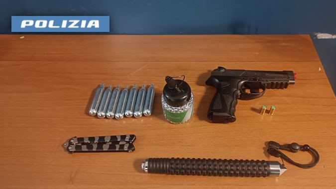 A seguito del controllo esperito all’interno del veicolo, è stata rinvenuta l’arma utilizzata per i raid, una pistola softair munita di caricatore rifornito di 3 pallini di 6 mm, un barattolo con circa 900 pallini dello stesso calibro, 7 bombolette di anidride carbonica per consentire il funzionamento dell’arma, uno sfollagente telescopico in acciaio e 2 proiettili a salve.