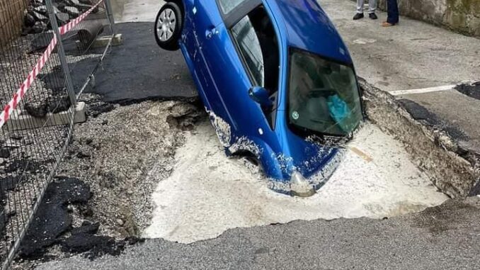 Oggi si è abbattuta su Napoli e provincia una vera e propria bomba d’acqua che sta causando numerosi danni. Al corso Vittorio Emanuele è sprofondato parte del parco Comola Ricci, la voragine ha risucchiato un’auto. Parte della strada è letteralmente sprofondata e la voragine che si è creata ha letteralmente inghiottito un’auto con una persona di 87 anni alla guida. Solo il pronto intervento dei carabinieri ha consentito di salvare l’uomo ed estrarlo dall’auto illeso. A Bagnoli, invece, esattamente in via Giusso, un tombino è “saltato” e la strada, di conseguenza, si è completamente allagata. Il tombino è ora invisibile e rappresenta un grave pericolo per la circolazione.