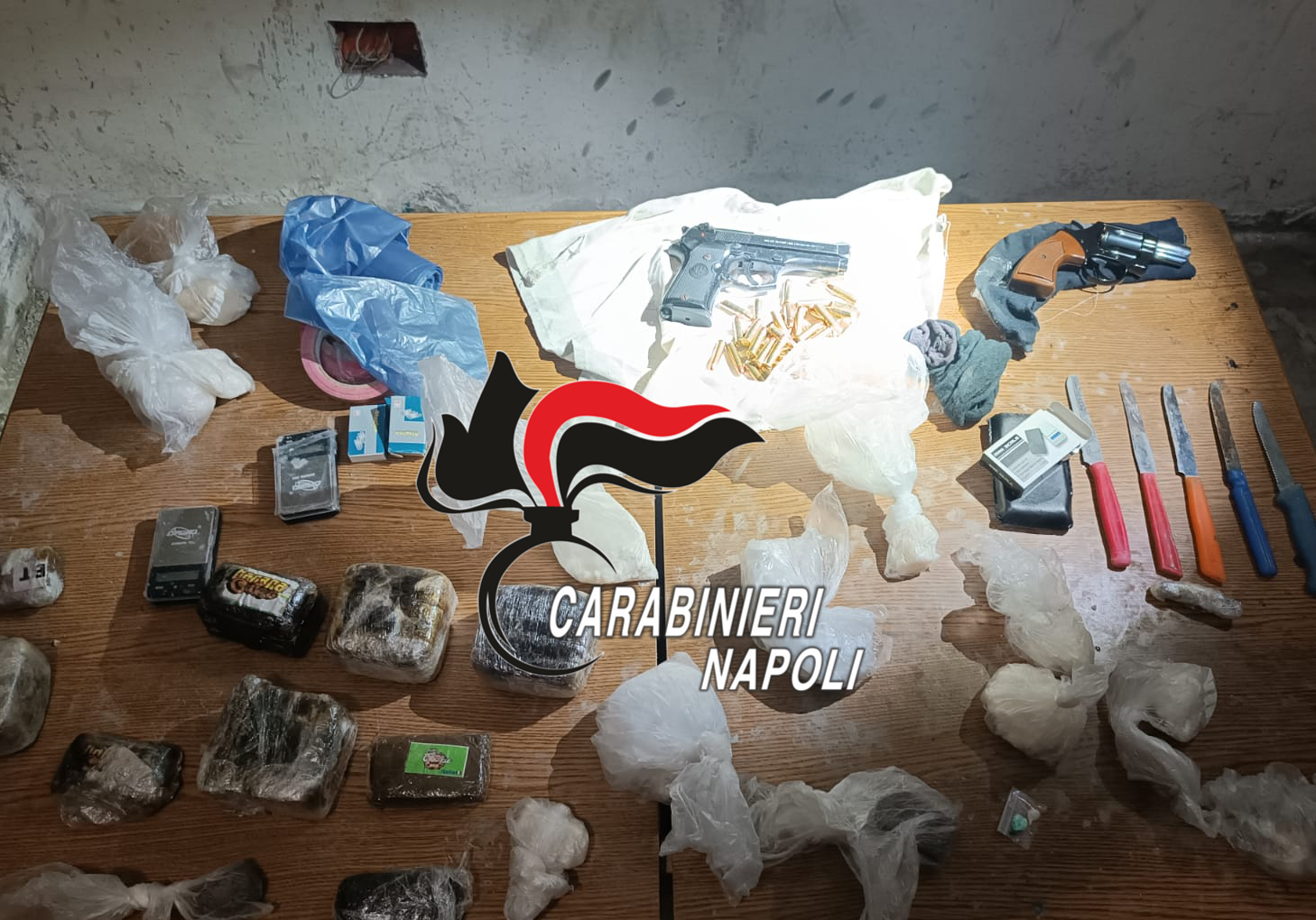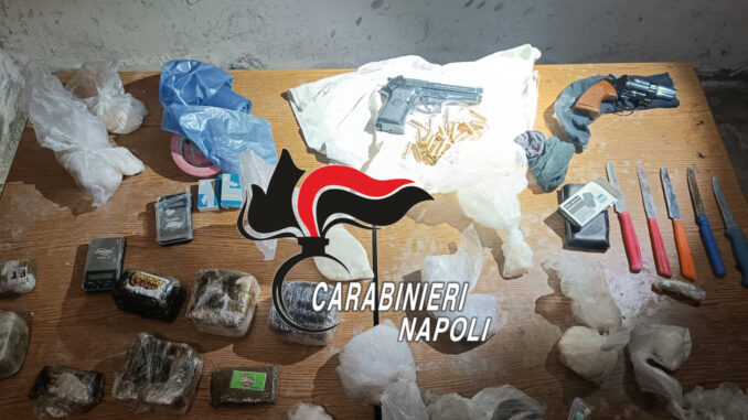 Contemporaneamente nelle palazzine popolari di Castello di Cisterna i Carabinieri hanno rinvenuto e sequestrato un pistola Beretta calibro 380 con caricatore e diverse dosi di marijuana pronte alla vendita. A finire in manette un 19enne incensurato del posto sorpreso all’interno di un palazzo. Il ragazzo aveva preso una busta con all’interno 30 dosi tra cocaina e crack che era nascosta sotto una mattonella di un gradino della scala condominiale.
