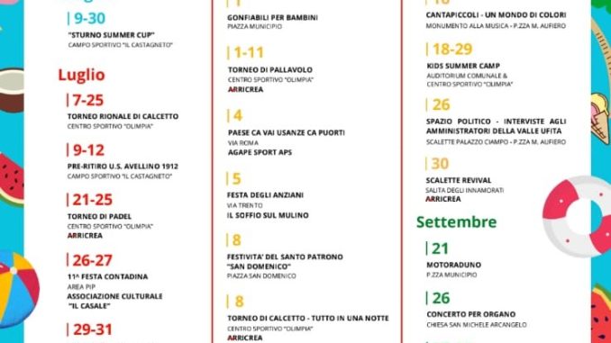 Il cartellone eventi parte il 9 giugno con la “Sturno Summer Cup”, torneo calcistico che animerà il campo sportivo “Il Castagneto” fino a fine mese.