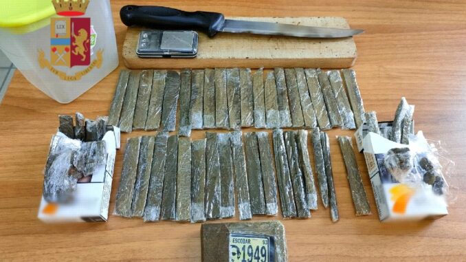 I poliziotti, con il supporto dell’Unità Cinofila dell’Ufficio Prevenzione Generale, hanno rinvenuto, all’interno di una busta nascosta dietro un mobile nella sala da pranzo, 37 stecche, 1 tavoletta e 16 pezzetti di hashish per circa 281 grammi, un bilancino di precisione, un tagliere e un coltello con la lama di 18 cm.