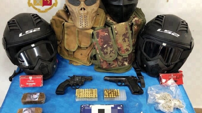 I poliziotti, in un altro edificio lungo la stessa strada, hanno rinvenuto, nel sottoscala, due caschi muniti di accessori per occultare il viso mentre, nella controsoffittatura dell’ingresso, altri tre involucri contenenti 33 grammi circa della stessa sostanza, la fotocopia di una targa di un motoveicolo e una pistola revolver a salve priva di tappo rosso.