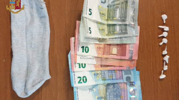 I poliziotti hanno raggiunto e bloccato lo spacciatore trovandolo in possesso di un calzino con 8 dosi contenenti circa 1,26 grammi di cocaina e 85 euro.