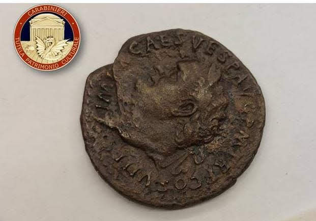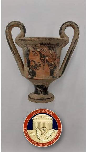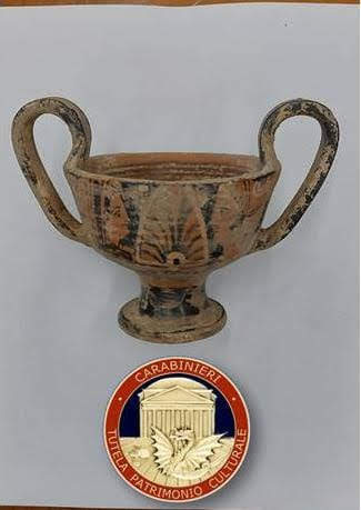 un dipinto, tecnica olio su tela, con cornice, raffigurante “Gesù – episodio Via Crucis”, provento di furto presso la Chiesa di Santa Margherita del Comune di Olevano Romano (RM); quattro volumi datati 1541, provento del furto commesso in danno della Biblioteca del Convento di San Pietro ad Aram di Napoli; un volume “Marmora Pisaurensia Notis. Illustrata”, provento di furto presso la Biblioteca ComunaleLiciniana – Termini Imerese; un unguentario in vetro con fondo piatto, con corpo conico e lungo collo cilindrico autentico dell’età imperiale I-II Sec. d.C.