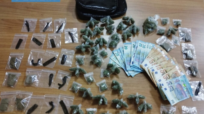 Gli operatori, avendo notato la scena e lo scambio, sono immediatamente intervenuti bloccando il prevenuto che è stato trovato in possesso di un borsello contenente 7 dosi di hashish del peso complessivo di circa 64 grammi, 7 bustine di marijuana del peso di circa 10 grammi e 810 euro in banconote di vario taglio; mentre, nella sella dello scooter, dove è stato notato prelevare il borsello contenente lo stupefacente, sono stati rinvenuti altri 108 involucri di hashish e marijuana del peso di circa 100 grammi.