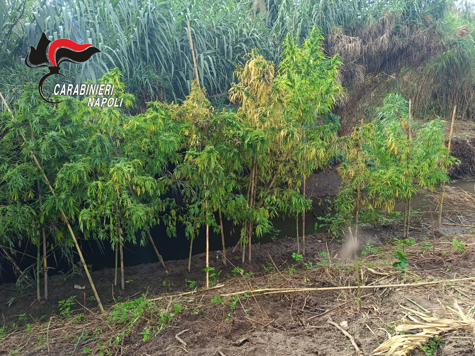 Una piantagione di marijuana pronta per essere raccolta, a due passi dal torrente con tanto di materiale per l’irrigazione e il fertilizzante.