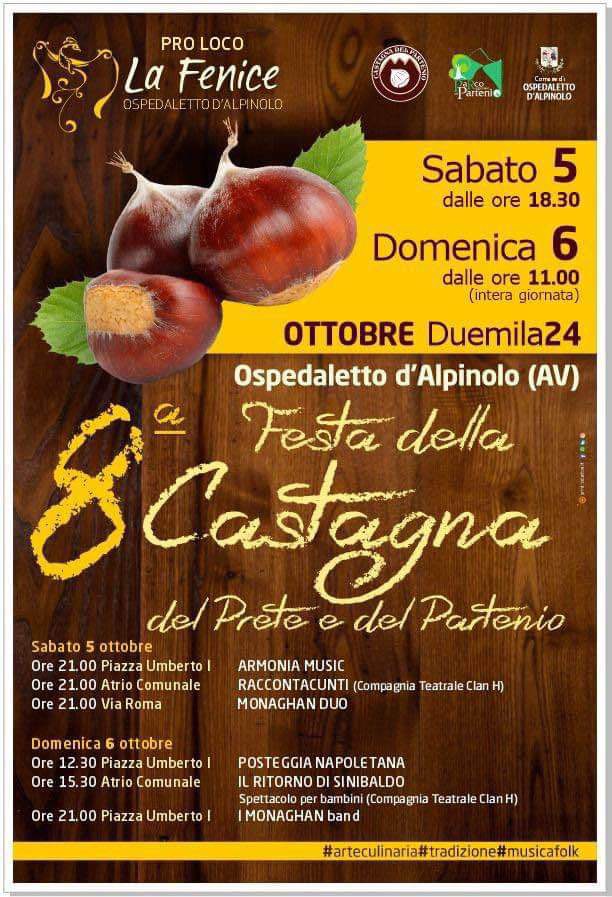 La Festa della Castagna del Prete e del Partenio si terrà ad Ospedaletto d’Alpinolo sabato 5 e domenica 6 ottobre 2024. Organizzata dalla Pro Loco “La Fenice”, l’evento offrirà un’esperienza unica con musica dal vivo di band locali come “Armonia Music” e”Monaghan band”