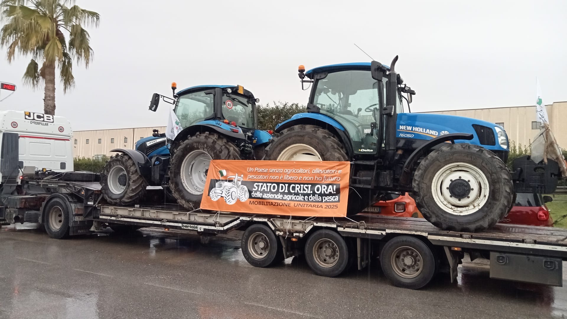È ufficialmente iniziato lo sciopero lumaca degli agricoltori del Movimento Nazionale dei Trattori, riconoscibile dalla bandiera bianca con il trattore che porta  bandiera italiana che sventola in alto.