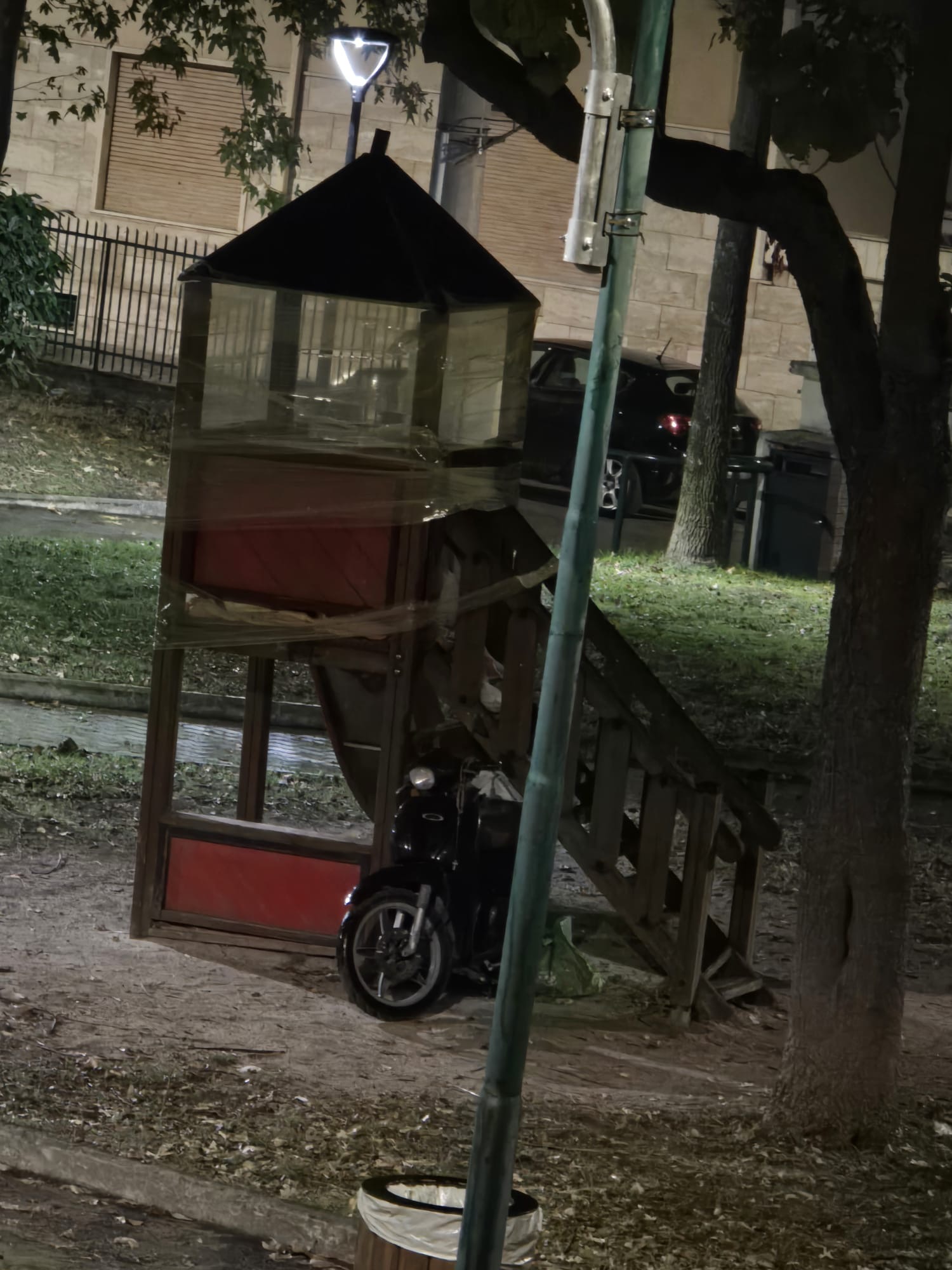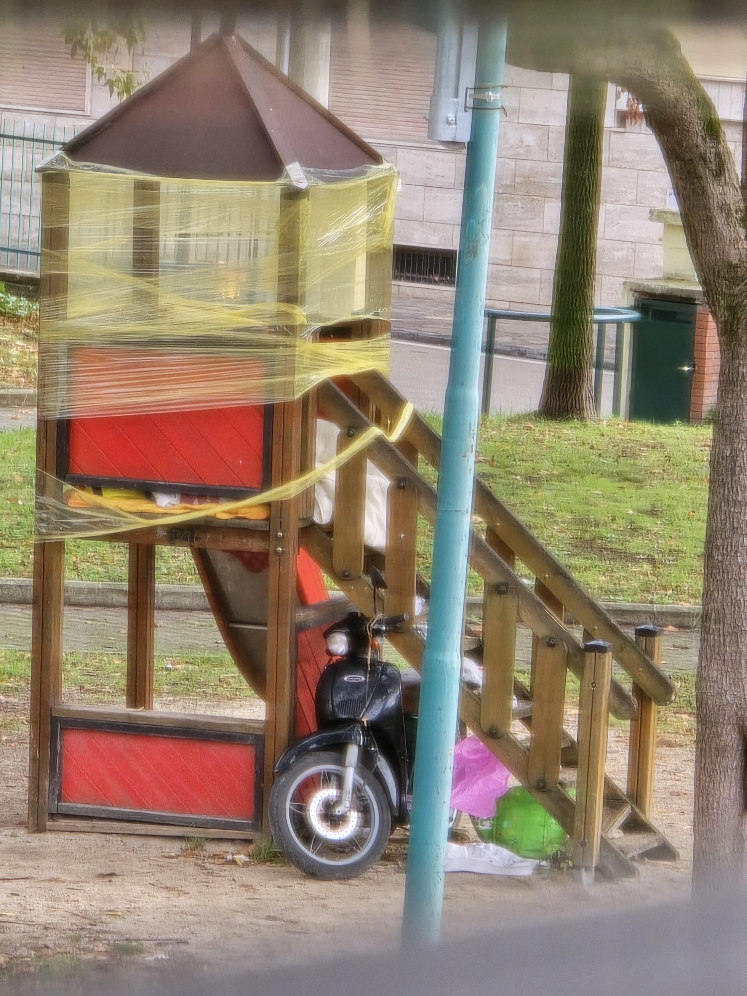 Il giovane si sarebbe sistemato nei pressi di una giostra, dove ha improvvisato una sorta di riparo, coprendo il tetto con foglie di celofan per proteggersi dalla pioggia e dal maltempo che ha interessato la zona in questi giorni.