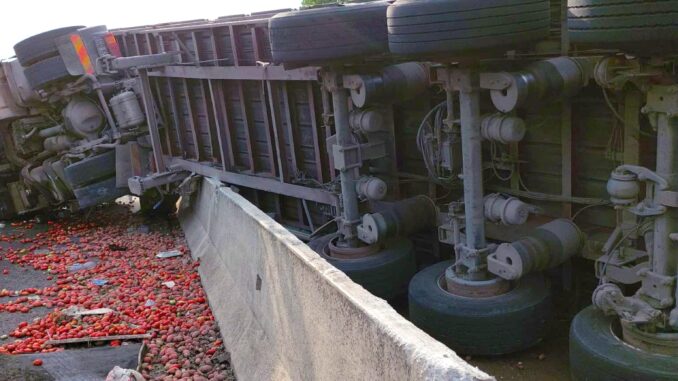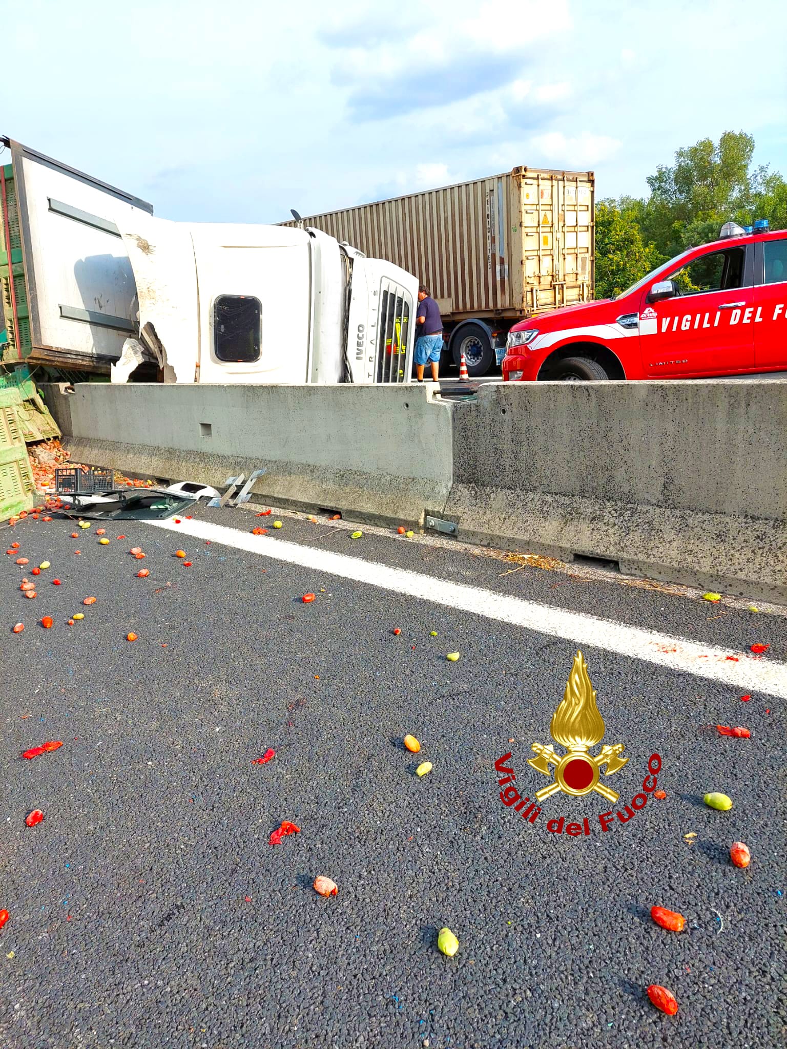 TUFINO. Grave incidente in autostrada, camion di pomodori si ribalta sulla corsia opposta. Un morto. Foto e Video. Incidente anche sulla Fondo Valle Sele in direzione Lioni.