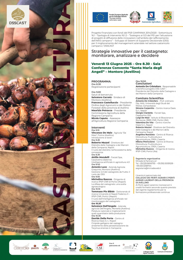Saranno riconosciuti 4 crediti formativi professionali ai Periti Agrari partecipanti, grazie al patrocinio del Collegio dei Periti Agrari e Periti Agrari Laureati della provincia di Avellino. DSSCAST è coordinato dall’Azienda Agricola De Maio di Forino (AV) e coinvolge aziende agricole, il Distretto delle Castagne e dei Marroni della Campania, enti di ricerca come Farzati Spa e Oasis Srl, enti di consulenza e formazione come MHI e CSI Formactions. Responsabile scientifico è il Prof. Antonio De Cristofaro, entomologo e docente universitario. Il progetto si propone di restituire valore e competitività alla castanicoltura campana, attraverso innovazione, sostenibilità e sinergia tra agricoltori, tecnici e ricercatori.