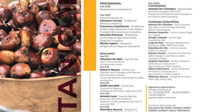 DSSCAST invita tutti gli operatori e cittadini interessati a partecipare all’iniziativa. Interverranno, tra gli altri, rappresentanti istituzionali come il sindaco di Montoro Salvatore Carratù, il presidente dell’Ordine degli Agronomi e dei Dottori Forestali della provincia di Avellino Francesco Castelluccio, il presidente della Commissione Agricoltura della Regione Campania Maurizio Petracca, l’assessore regionale all’agricoltura Nicola CaputoVincenzo De Maio – Agricola “De Maio”, Forino (Avellino), Roberto Mazzei, Direttore del Distretto delle Castagne e dei Marroni della Campania, su “Il ruolo del distretto nell’ecosistema della conoscenza”, Attilio Mondelli, Farzati Spa, su “Intelligenza artificiale in agricoltura 4.0”, Antonio Luce, Azienda Agricola Giaquinto, Montoro (Avellino) su “Gestione 4.0 del castagneto da frutto: il ruolo dei DSS”,  Michelina Ruocco – Dirigente di ricerca IPSP-CNR di Portici (Napoli), su “La difesa del castagneto: una scelta agroecologica”, Tommaso Pio Bibbò, Dottorando di ricerca Università di Napoli Federico II – IPSP-CNR, Portici (Napoli), su “Il ruolo dell’intelligenza artificiale nel monitoraggio del castagneto”, Salvatore Dell’Angelo – Azienda agricola Dell’Angelo, Montella (Avellino), su “Potatura razionale e miglioramenti quali-quantitativi della produzione”, Davide Della Porta – Centro di Ricerca Oasis srl, su “Cinipide galligeno del castagno e andamento della parassitizzazione da Torymus sinensis in Campania”. Le conclusioni sono affidate ad Antonio De Cristofaro, responsabile scientifico progetto DSS-CAST e presidente del Distretto delle Castagne e dei Marroni della Campania.