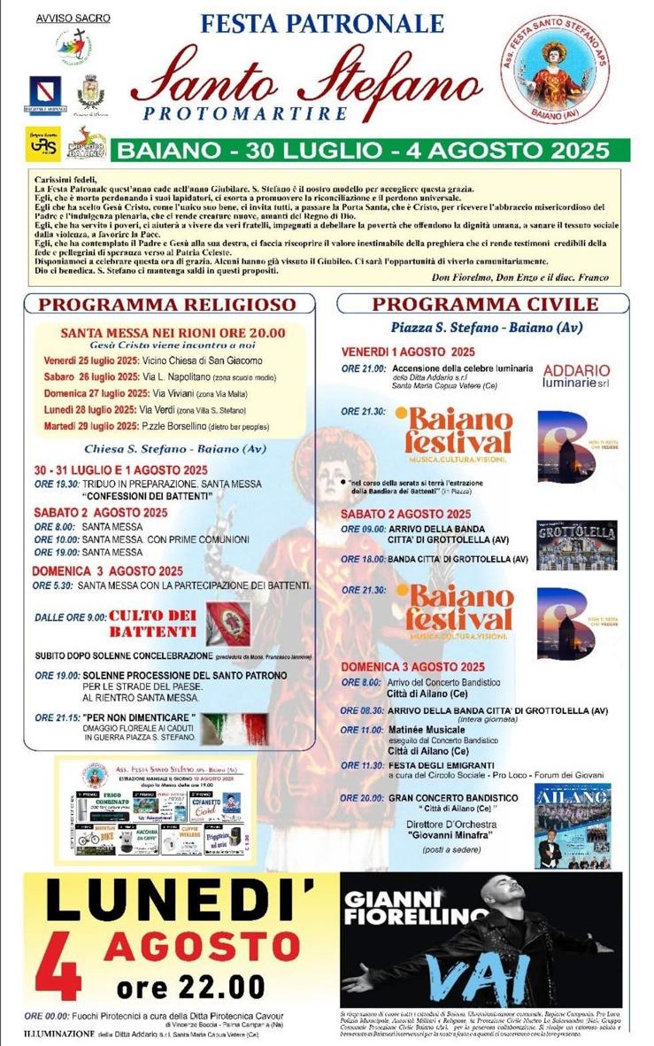 Il programma dei festeggiamenti civili è ricco e vario, oltre al “Baiano Festival”, ci sarà il 4 agosto il concerto di Gianni Fiorellino.