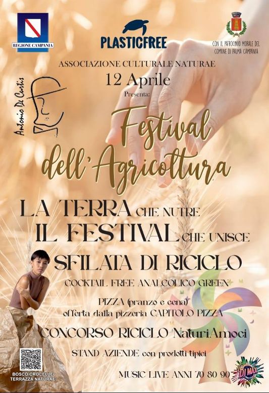 «Come presidente dell’Associazione Culturale Naturae e referente territoriale Plastic Free, sono felice di annunciare la nascita della prima edizione del Festival dell’Agricoltura, un evento che celebra le tradizioni, la sostenibilità e l’innovazione», queste le parole di Rosa Ferrante, che aggiunge: «Questo festival sarà un’esperienza unica e poliedrica. Bosco Crocelle e Terrazza Naturae diventeranno il palcoscenico di esperienze uniche dedicate alla terra, alla creatività e alla sostenibilità. Vieni a vivere una giornata ricca di sorprese: dal riciclo creativo alla musica anni ’70/’80, dalle esposizioni di prodotti biologici alla sfilata di moda sostenibile, al concorso riciclo in vista, con il coinvolgimento delle scuole e delle associazioni del territorio. Inoltre, ci saranno stand di aziende locali che esporranno i loro prodotti genuini e artigianali. E poi, come anticipato, ad arricchire la giornata ci sarà la musica iconica degli anni ‘70, ‘80 e ‘90, musica ritmata e drink analcolici per i giovani, l’inconfondibile sapore della nostra amata pizza da degustare e DJ Max che creerà un’atmosfera unica con melodie soft».