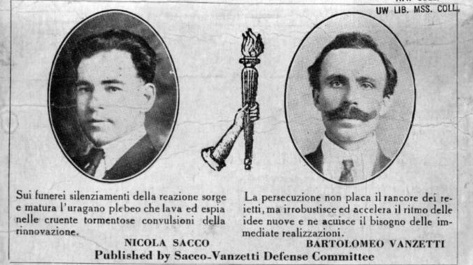 Il 15 aprile 1920 a South Braintree, nel Massachusetts, durante una rapina a una fabbrica di calzature furono uccisi un cassiere e una guardia armata. Pochi giorni dopo Sacco, operaio calzaturiero, e Vanzetti, venditore ambulante, furono arrestati e accusati dell’omicidio.