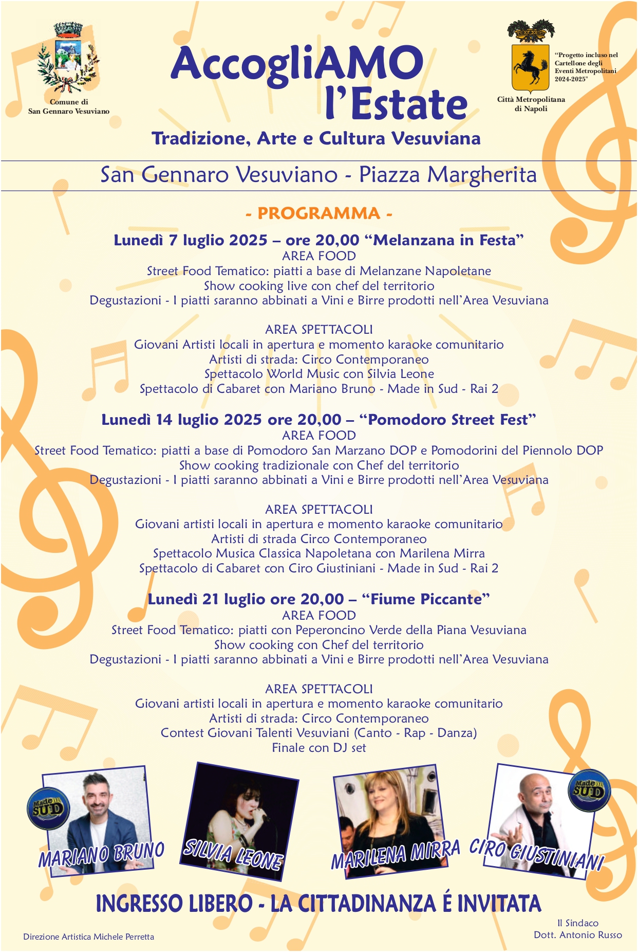 Durante tutte le serate il centro cittadino si trasformerà in un vero e proprio crocevia di sapori, musica ed emozioni, con spettacoli di alta qualità e un’energia contagiosa capace di coinvolgere tutte le generazioni. Il coinvolgimento attivo dei giovani sarà uno dei punti di forza del festival, pensato come una festa collettiva che unisce le radici della tradizione vesuviana con le tendenze artistiche contemporanee.