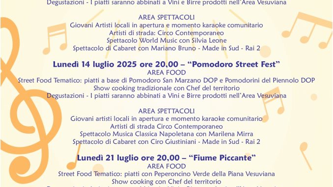 La rassegna si chiuderà lunedì 21 luglio con “Fiume Piccante”, dedicato al peperoncino della Piana Vesuviana, con stand gastronomici, contest per giovani talenti vesuviani (canto, rap, danza), artisti di strada, karaoke comunitario e un gran finale con DJ set.