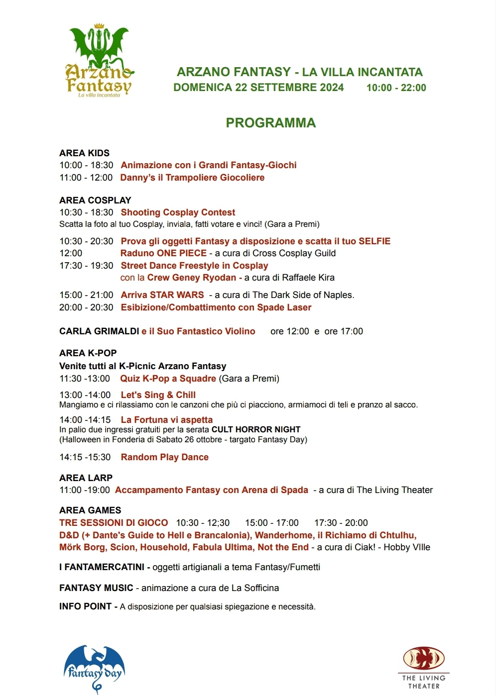 Tante sono le Aree Tematiche previste dall’Arzano Fantasy che, come spin-off del Fantasy Day, raccoglie i frutti degli oltre 15 anni di esperienza di una manifestazione che è il fiore all’occhiello della città di San Giorgio a Cremano e a cui si è aggiunta l’ultradecennale esperienza organizzativa in eventi, spettacoli e Gioco di Ruolo dello staff dell’Associazione The Living Theater. Queste due realtà, con la passione che le contraddistingue da sempre, sono capaci di originare un movimento aggregativo dal forte valore positivo nonché un volano di crescita culturale ed economica.